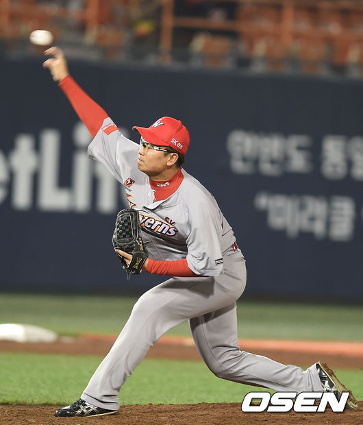7회말 SK 박종훈에 이어 전유수가 역투하고 있다.