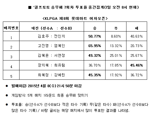 국민체육진흥공단(www.kspo.or.kr)이 발행하는 체육진흥투표권 수탁사업자인 스포츠토토 공식 온라인 발매 사이트인 베트맨(www.betman.co.kr)은 오는 9일에 롯데 스카이힐 제주에서 열리는 'KLPGA 제8회 롯데마트 여자오픈' 1라운드를 대상으로 한 골프토토 승무패 8회차 1번 매치에서 A선수인 김효주(50.77%)가 B선수인 전인지(40.63%)보다 좋은 성적을 기록할 것으로 예상했다고 밝혔다.