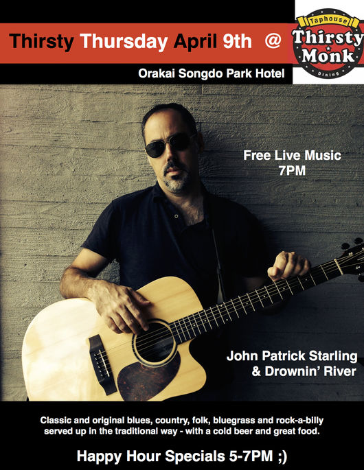 아메리칸 싱어송 라이터이자 송도 거주민인 존 패트릭 스탈링(John Patrick Starling)과 그가 이끄는 '드라우닝 리버(Drownin River)'가 오라카이 송도파크 호텔 써시티 몽크에서 매월 둘째 주 목요일 공연에 나선다. 첫 번째 공연은 오는 9일 저녁 7시이며 써시티 몽크를 찾는 이들은 무료로 공연을 즐길 수 있다.