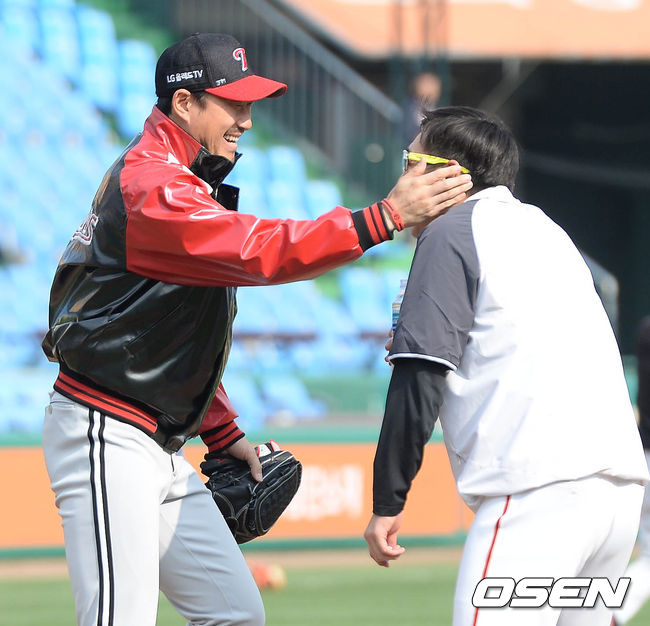 7일 오후 대전시 한화생명 이글스 파크에서 열리는 '2015 타이어뱅크 KBO 리그' 한화 이글스와 LG 트윈스의 경기 시작전 봉중근과 송은범이 이야기를 나누고 있다.