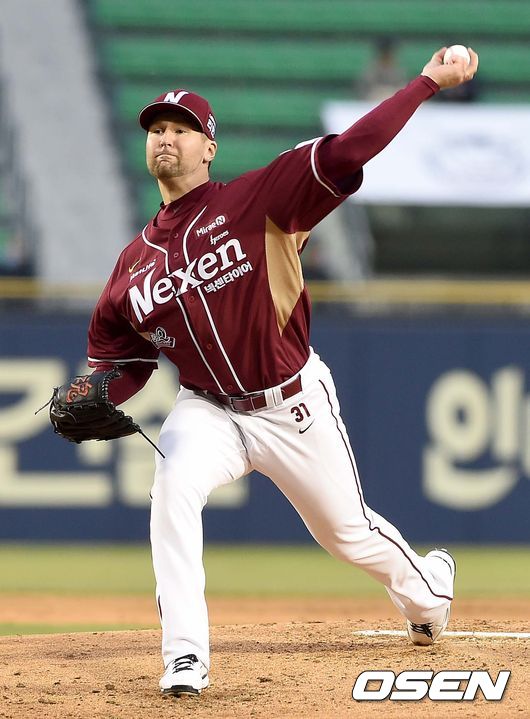 넥센 선발 피어밴드가 힘차게 공을 뿌리고 있다.