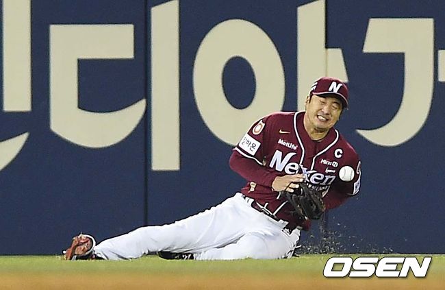 2회말 두산 공격 1사 주자없는 상황 오재원의 2루타 때 넥센 중견수 이택근이 타구를 몸을 막아내고 있다.