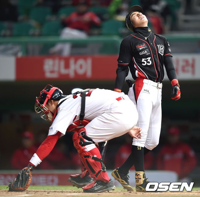 2회초 2사 1,2루 kt 이대형이 삼진을 당한 뒤 아쉬워하고 있다.