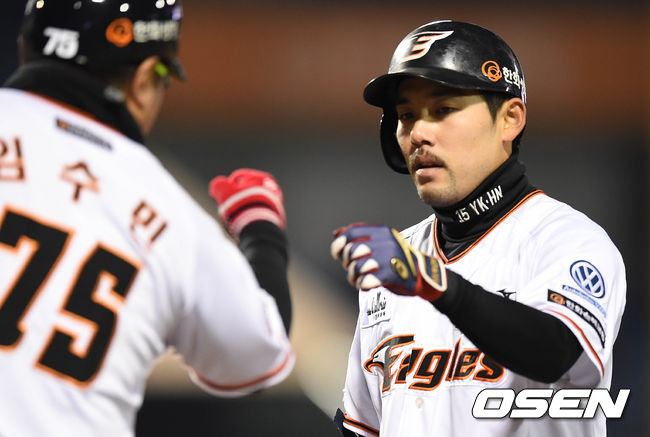 7일 오후 대전시 한화생명 이글스 파크에서 열린 '2015 타이어뱅크 KBO 리그' 한화 이글스와 LG 트윈스의 경기 3회말 1사 2루 이용규가 1타점 적시타를 치고 1루에서 임수민 코치와 하이파이브를 하고 있다.