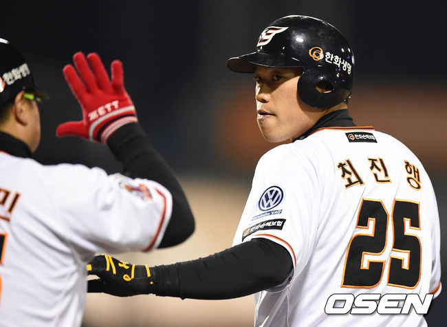 7일 오후 대전시 한화생명 이글스 파크에서 열린 '2015 타이어뱅크 KBO 리그' 한화 이글스와 LG 트윈스의 경기 3회말 1사 1,3루 최진행이 1타점 적시타를 치고 1루에서 임수민 코치와 하이파이브를 하고 있다.