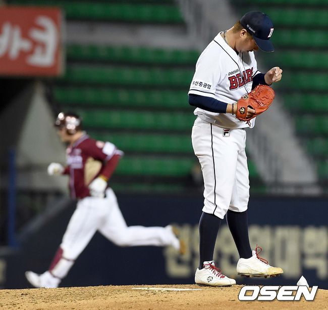 3회초 넥센 공격 1사 주자없는 상황 박병호에게 좌월 솔로포를 허용한 두산 선발 유희관이 아쉬워하고 있다.