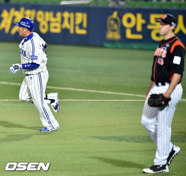 7일 오후 대구시민운동장 야구장에서 열린 '2015 타이어뱅크 KBO 리그' 삼성 라이온즈와 롯데 자이언츠의 경기, 4회말 1사 삼성 최형우가 우중월 선취 솔로홈런을 날린 후 그라운드를 돌고 있다.