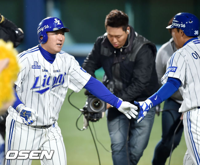 7일 오후 대구시민운동장 야구장에서 열린 '2015 타이어뱅크 KBO 리그' 삼성 라이온즈와 롯데 자이언츠의 경기, 4회말 1사 삼성 최형우가 우중월 선취 솔로홈런을 날린 후 홈을 밟은 후 이승엽과 하이파이브를 하고 있다.