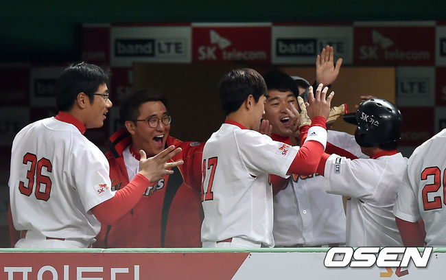 3회말 2사 1루 SK 김성현이 조동화의 적시타로 득점을 올린 뒤 기뻐하고 있다.