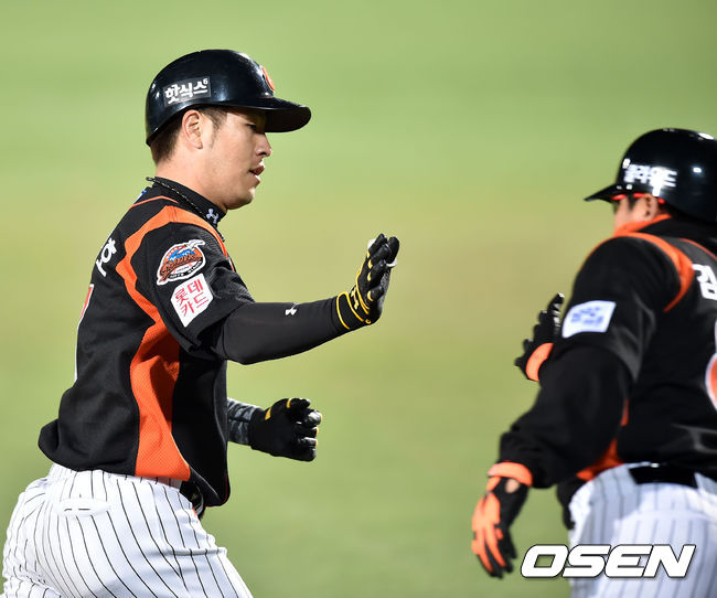 7일 오후 대구시민운동장 야구장에서 열린 '2015 타이어뱅크 KBO 리그' 삼성 라이온즈와 롯데 자이언츠의 경기, 5회초 롯데 선두타자 강민호가 중월 동점 솔로 홈런을 날린 후 3루에서 김응국 코치와 하이파이브를 하고 있다.