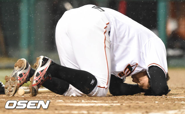 7일 오후 대전시 한화생명 이글스 파크에서 열린 '2015 타이어뱅크 KBO 리그' 한화 이글스와 LG 트윈스의 경기 4회말 1사 정범모가 임정우의 볼에 몸을 맞고 고통스러워하고 있다.
