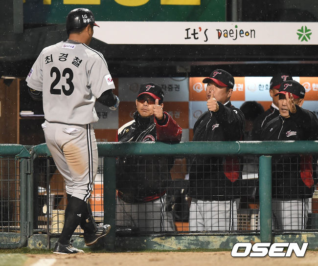7일 오후 대전시 한화생명 이글스 파크에서 열린 '2015 타이어뱅크 KBO 리그' 한화 이글스와 LG 트윈스의 경기 5회초 선두타자 최경철이 솔로홈런을 치고 덕아웃에서 양상문 감독과 하이파이브를 하고 있다.