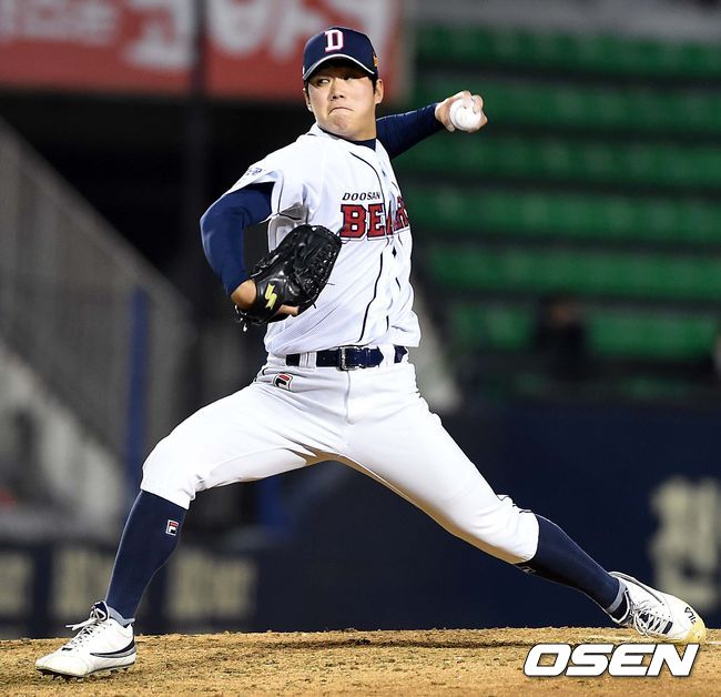 7회초 넥센 공격 때 두산 투수 함덕주가 힘차게 공을 뿌리고 있다.
