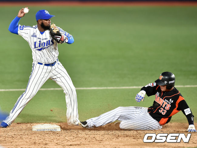 7일 오후 대구시민운동장 야구장에서 열린 '2015 타이어뱅크 KBO 리그' 삼성 라이온즈와 롯데 자이언츠의 경기, 7회초 1사 주자 1루 롯데 강민호의 유격수 병살타때 삼성 2루수 나바로가 2루에서 롯데 정훈을 포스아웃 시킨 후 1루로 송구하고 있다.