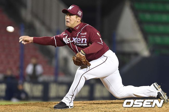 7회말 두산 공격 1사 2, 3루 상황 마운드에 오른 넥센 투수 마정길이 힘차게 공을 뿌리고 있다.