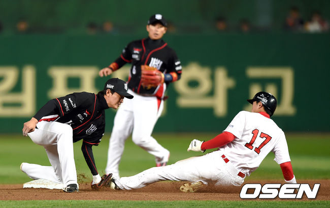 6회말 2사 1루 SK 이명기가 2루 도루를 시도하다 아웃 당하고 있다.