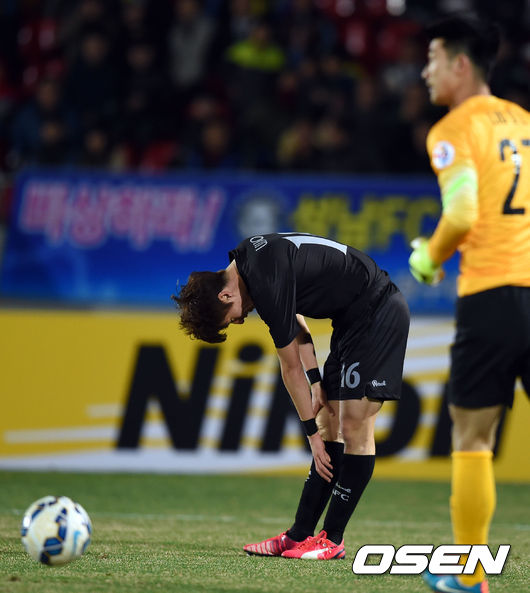 7일 오후 경기도 성남시 성남탄천종합운동장서 열린 2015 AFC(아시아축구연맹) 챔피언스리그(ACL) F조 성남FC(한국)와 광저우 푸리(중국)의 경기, 후반 성남FC 황의조가 오프사이드 판정에 아쉬워하고 있다
