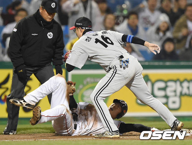 7일 오후 대전시 한화생명 이글스 파크에서 열린 '2015 타이어뱅크 KBO 리그' 한화 이글스와 LG 트윈스의 경기 6회말 2사 1,3루 이용규 타석, 1루주자 김경언이 런다운에 걸린 사이 3루주자 김회성이 도루를 시도하다 3루로 돌아오면서 아웃 당하고 있다.