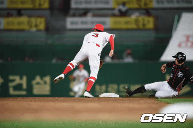 7회초 2사 1루 kt 김사연이 2루 도루를 시도하다 SK 이재원의 송구가 실책으로 3루까지 진루하려다 귀루하고 있다.