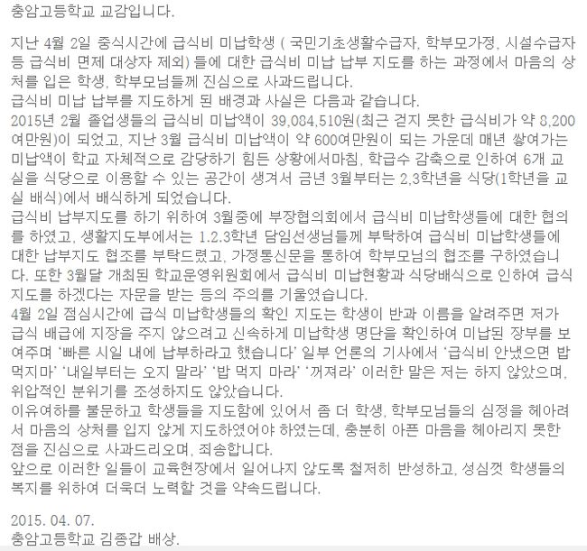 [OSEN=이슈팀] 급식비 미납학생에 막말을 한 것으로 알려진 서울 충암고 김모 교감이 직접 홈페이지에 사과글을 올려 관심을 모았다.