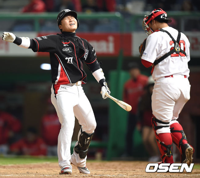 8회초 2사 2루 kt 용덕한이 삼진을 당한 뒤 아쉬운표정을 짓고 있다.