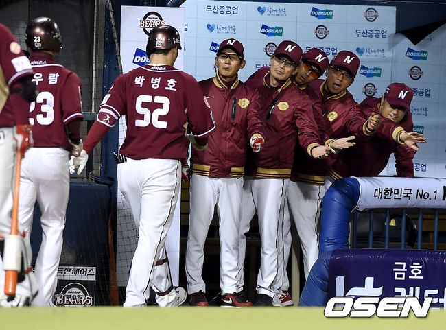9회초 넥센 공격 1사 1, 3루 상황 박병호가 중월 스리런포를 날리고 홈을 밟은 뒤 염경엽 감독을 비롯한 코칭스태프와 인사를 나누고 있다.