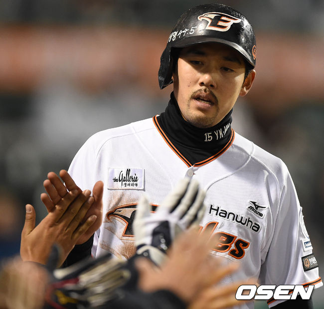 7일 오후 대전시 한화생명 이글스 파크에서 열린 '2015 타이어뱅크 KBO 리그' 한화 이글스와 LG 트윈스의 경기 7회말 1사 1,2루 이시찬의 1타점 적시타에 득점한 이용규가 덕아웃에서 동료들과 하이파이브를 하고 있다.