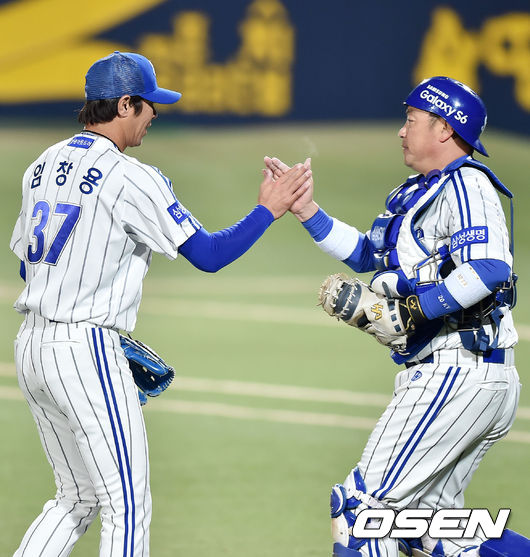 경기를 마치고 삼성 임창용이 진갑용과 하이파이브를 하고 있다./ rumi@osen.co.kr