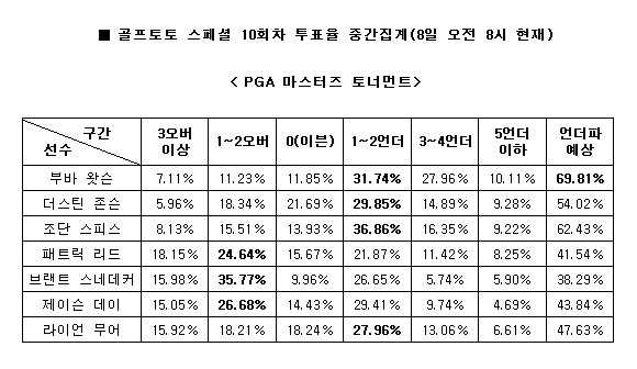 국내 골프팬들은 PGA투어 마스터즈 토너먼트에서 부바 왓슨의 언더파 가능성을 높게 예상했다.