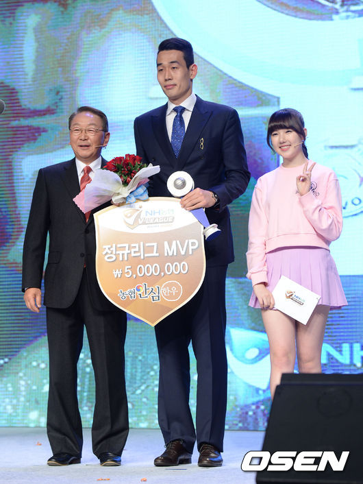 레오와 이효희, 니콜은 8일 오후 영등포구 여의도 63컨벤션센터 2층 그랜드볼룸서 열린 NH농협 2014-2015 V-리그 시상식서 정규리그 MVP(최우수선수)를 수상했다.