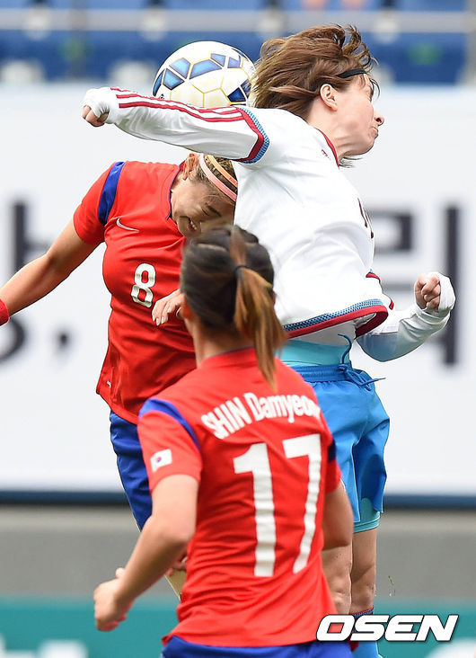 8일 오후 대전월드컵경기장에서 열린 대한민국 여자축구대표팀과 러시아 여자축구대표팀의 평가전 경기 전반 조소현이 헤딩을 시도하고 있다.