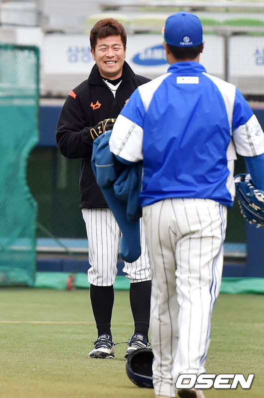 8일 오후 대구시민운동장 야구장에서 '2015 타이어뱅크 KBO 리그' 삼성 라이온즈와 롯데 자이언츠의 경기가 열릴 예정인 가운데, 삼성 덕아웃에서 류중일 감독이 그라운드 위에서 롯데 강민호에게 오늘은 홈런치지 말라는 말에 미소로 답하고 있다.