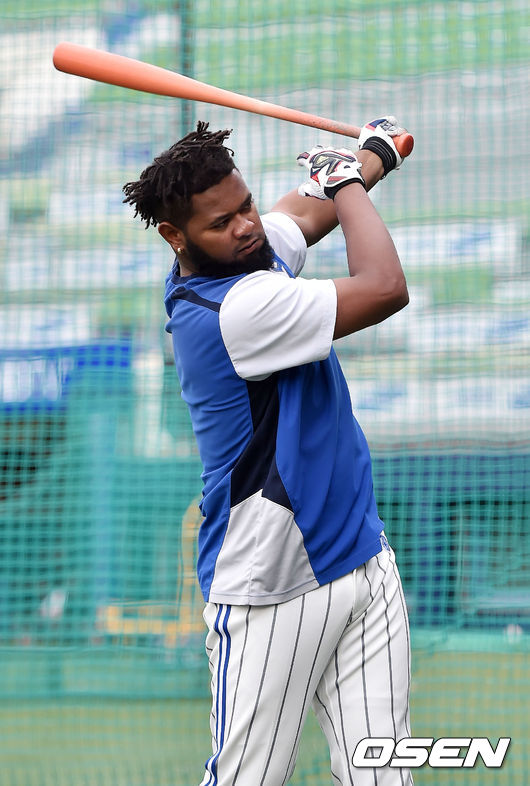 8일 오후 대구시민운동장 야구장에서 '2015 타이어뱅크 KBO 리그' 삼성 라이온즈와 롯데 자이언츠의 경기가 열릴 예정인 가운데, 삼성 나바로가 타격연습을 하고 있다.