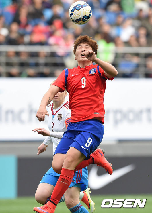 8일 오후 대전월드컵경기장에서 열린 대한민국 여자축구대표팀과 러시아 여자축구대표팀의 평가전 경기 후반 박은선이 문전에서 헤딩을 시도하고 있다.