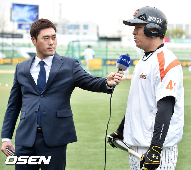 8일 오후 대구시민운동장 야구장에서 '2015 타이어뱅크 KBO 리그' 삼성 라이온즈와 롯데 자이언츠의 경기가 열릴 예정인 가운데, 롯데 강민호의 인터뷰를 조성환 KBS N 해설위원이 하고 있다.