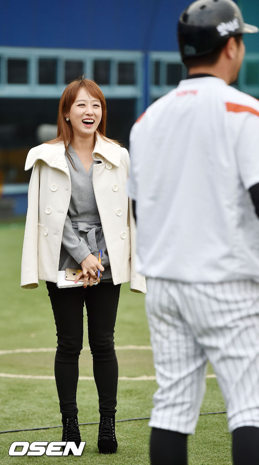 8일 오후 대구시민운동장 야구장에서 '2015 타이어뱅크 KBO 리그' 삼성 라이온즈와 롯데 자이언츠의 경기가 열릴 예정인 가운데, 윤재인 KBS N 아나운서가 롯데 강민호의 말에 환하게 웃고 있다.