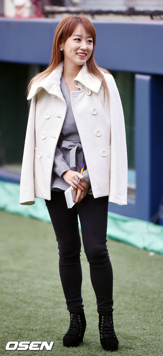 8일 오후 대구시민운동장 야구장에서 '2015 타이어뱅크 KBO 리그' 삼성 라이온즈와 롯데 자이언츠의 경기가 열릴 예정인 가운데, 윤재인 KBS N 아나운서가 미소짓고 있다.