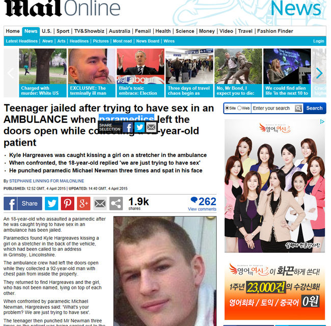 4일(이하 한국시간) 영국 매체 '데일리메일'은 "92세 환자를 이송하기 위해 문이 열려 있던 구급차에 들어가 성관계를 시도한 10대가 투옥됐다"고 보도했다. 카일 하그리브스(18)라는 소년은 철없는 행동에 인생에 오점을 남기게 됐다.