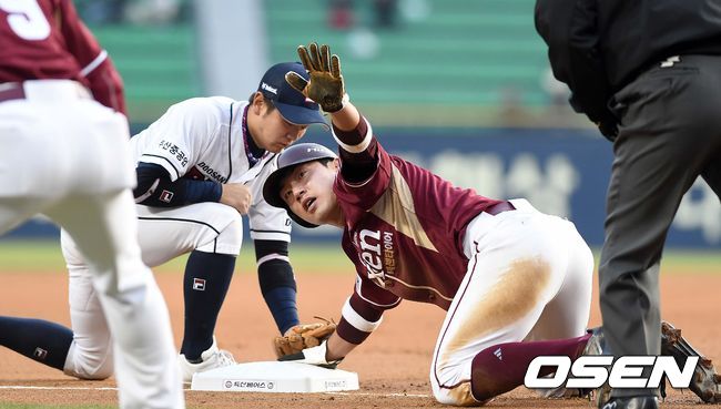 1회초 넥센 공격 무사 1루 상황 이택근의 중견수 플라이 때 2루 주자 서건창이 3루로 태그업해 두산 3루수 최주환의 태그보다 앞서 세이프 된 뒤 타임을 요청하고 있다.