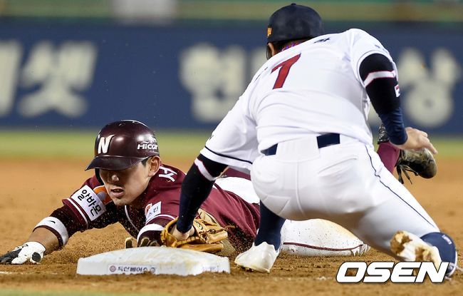 2회초 넥센 공격 1사 2루 상황 이택근 타석 때 2루 주자 서건창이 3루 도루를 시도하다 두산 3루수 최주환의 태그에 걸려 아웃되고 있다.