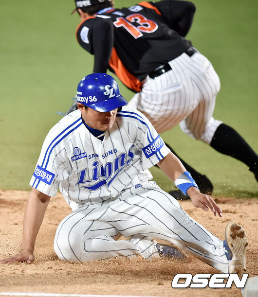 8일 오후 대구시민운동장 야구장에서 열린 '2015 타이어뱅크 KBO 리그' 삼성 라이온즈와 롯데 자이언츠의 경기, 3회말 무사 주자 1루 삼성 김상수의 중견수앞 안타때 1루 주자 이지영이 3루에 몸을 던지며 세이프 되고 있다.