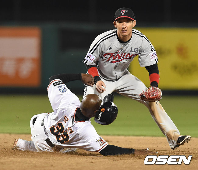 8일 오후 대전시 한화생명 이글스 파크에서 열린 '2015 타이어뱅크 KBO 리그' 한화 이글스와 LG 트윈스의 경기 7회말 무사 1루 정범모의 유격수 앞 땅볼에 1루주자 모건이 2루에서 아웃 당하고 있다.