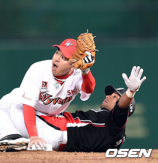 8일 오후 인천 문학구장에서 열린 '2015 타이어뱅크 KBO 리그' 인천 SK와 수원 kt의 경기,7회초 kt 마르테가 2루타를 날리고 2루에 세이프되고 있다.