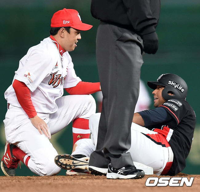 8일 오후 인천 문학구장에서 열린 '2015 타이어뱅크 KBO 리그' 인천 SK와 수원 kt의 경기,7회초 kt 마르테가 2루타를 날리고 2루에 세이프된 뒤 나주환 2루수를 바라보고 있다.