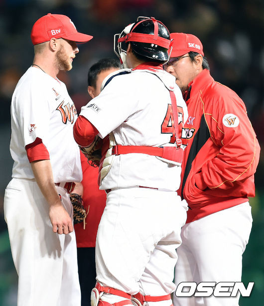 8일 오후 인천 문학구장에서 열린 '2015 타이어뱅크 KBO 리그' 인천 SK와 수원 kt의 경기,7회초 동점 허용한 SK 켈리 선발투수가 김상진 투수코치와 마운드서 이야기를 나누고 있다