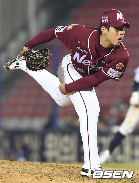 6회말 두산 공격 때 마운드에 오른 넥센 투수 이상민이 힘차게 공을 뿌리고 있다.