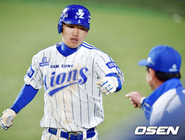 8일 오후 대구시민운동장 야구장에서 열린 '2015 타이어뱅크 KBO 리그' 삼성 라이온즈와 롯데 자이언츠의 경기, 7회말 1사 주자 3루, 삼성 김상수의 중견수 희생플라이때 3루주자 박해민이 홈을 밟은 후 덕아웃에서 류중일 감독과 하이파이브를 하고 있다.