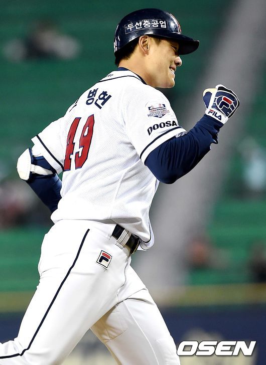 6회말 두산 공격 2사 2, 3루 상황 대타 민병헌이 좌월 스리런포를 날리고 환호하며 그라운드를 돌고 있다.