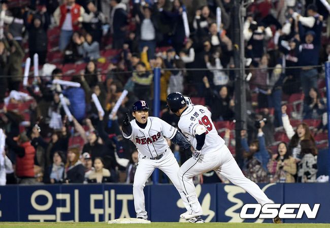 6회말 두산 공격 2사 2, 3루 상황 대타 민병헌이 좌월 스리런포를 날리고 강동우 코치와 환호하며 그라운드를 돌고 있다.