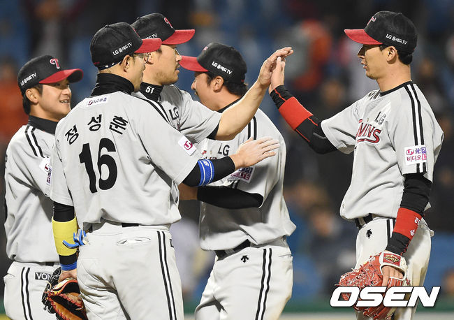 8일 오후 대전시 한화생명 이글스 파크에서 열린 '2015 타이어뱅크 KBO 리그' 한화 이글스와 LG 트윈스의 경기 종료 후 LG 선수들이 하이파이브를 하고 있다.